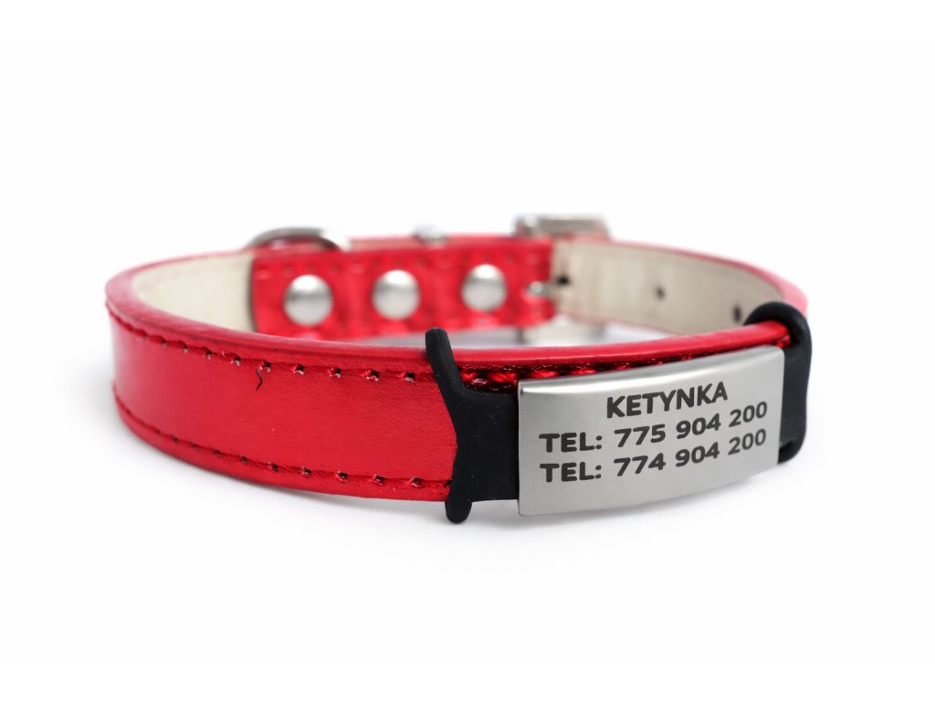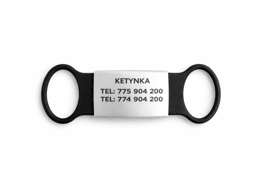 Identifikační známka je navlečená na pružném silikonovém pásku s dvěmi očky.
