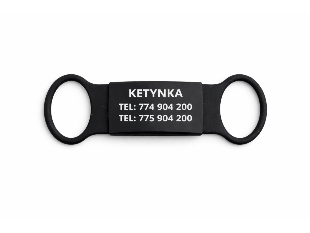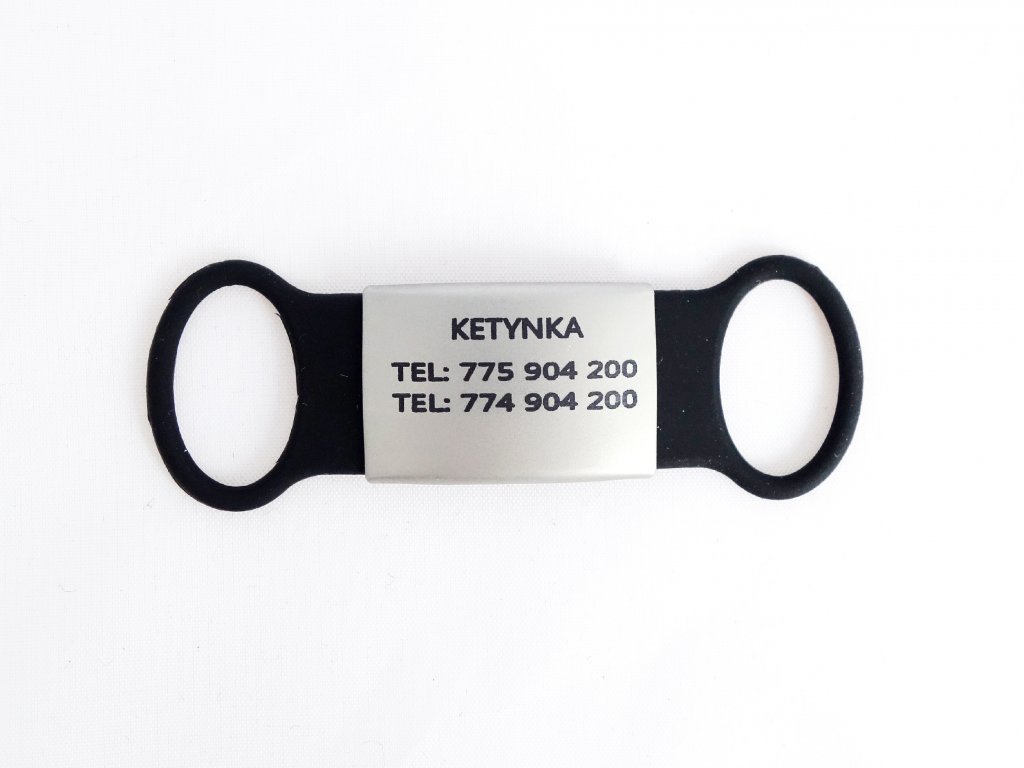 Identifikační známka je navlečená na pružném silikonovém pásku se dvěma očky.